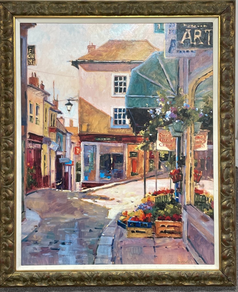 A cozy European street scene rendered in warm tones and soft impressionistic detail. From the flower-filled storefronts to the gentle curve of cobblestone, Simandale captures the quiet poetry of everyday beauty.
