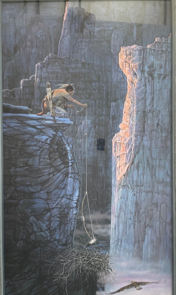 A moment of reverence and ingenuity unfolds in this canyon scene, where a lone figure—poised on the edge of a cliff—lowers a bow toward an eagle’s nest nestled far below. Julie Cramer Cole captures the quiet tension and spiritual connection between human and nature with masterful detail and light. A tribute to survival, respect, and the wisdom of tradition.