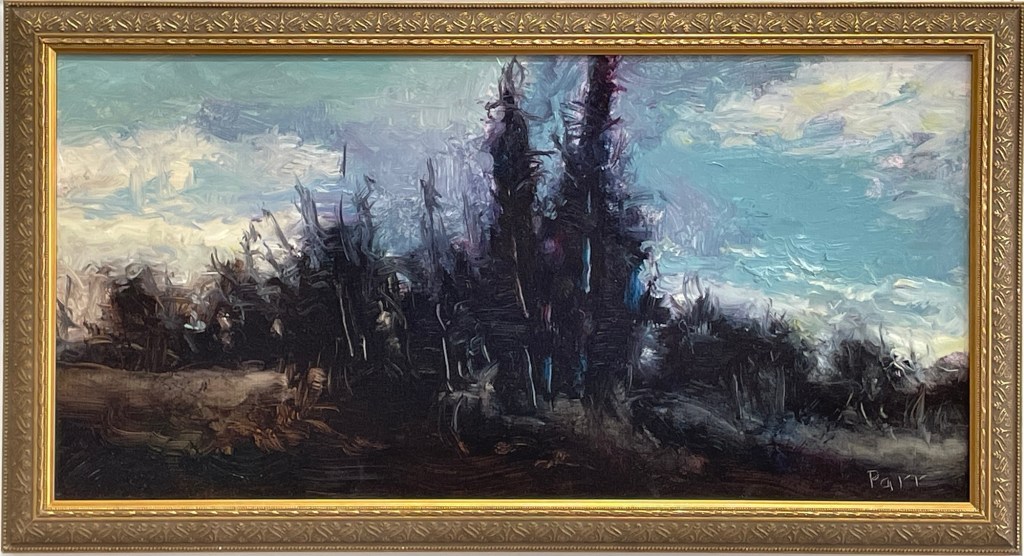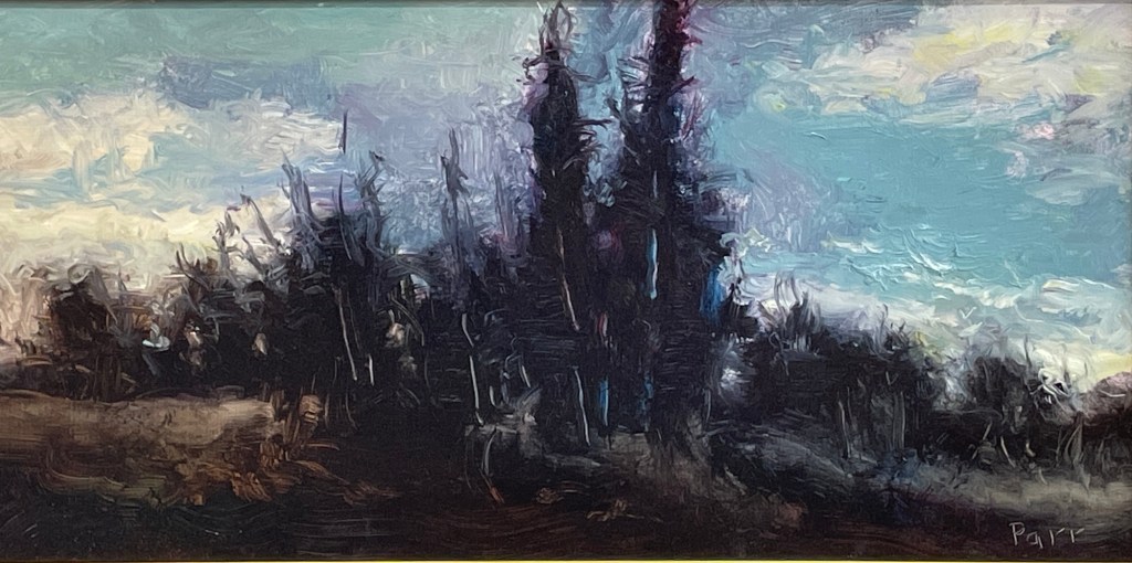 A brooding stand of trees anchors the horizon, silhouetted against a sky in flux—where light and shadow wrestle for dominance. Parr’s brushwork captures the tension of nature’s quiet interludes, when the air holds its breath and the land waits.