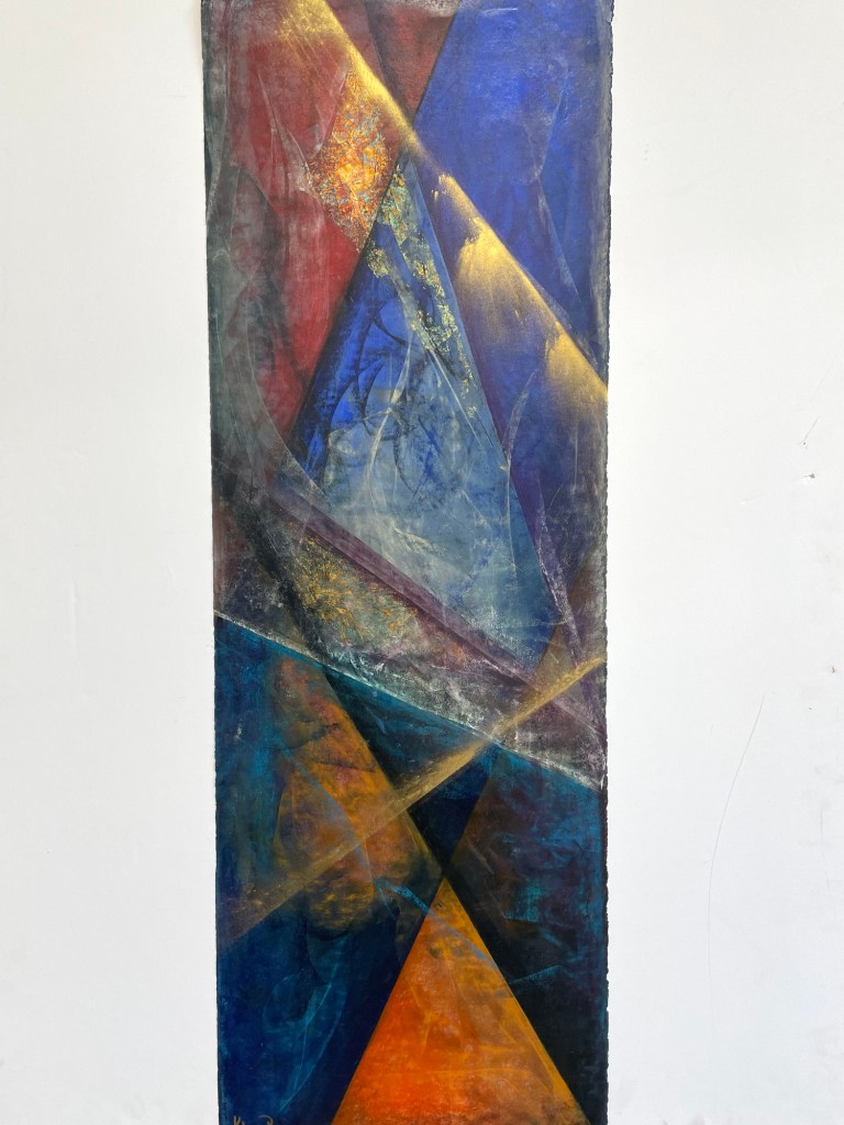 A vertical composition of layered geometry and bold color, Abstract #911 by Kati Roberts commands attention. Deep blues, fiery reds, and metallic golds intersect in textured planes, evoking motion, tension, and radiant depth.