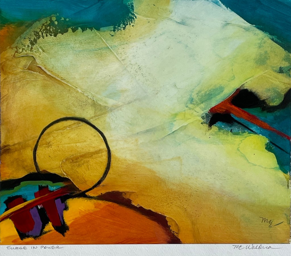 Description: A bold interplay of color and form drives this dynamic composition by Martin Waldera. Teal, ochre, and crimson collide across the paper, anchored by a striking black circle and red diagonal that slice through the field. Vertical accents in purple and red add rhythm and contrast, evoking a surge of energy and transformation. A compact piece with commanding presence.