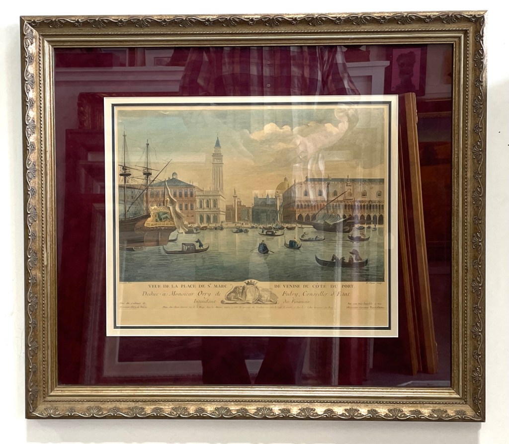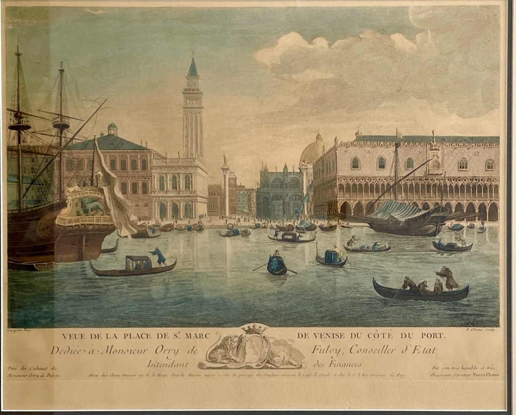A finely detailed 18th-century view of Venice’s Piazza San Marco, engraved by Thomas Milton after a drawing by Canaletto. This rare lithograph captures the grandeur of Venetian architecture and maritime life, with gondolas gliding past the Doge’s Palace and the Campanile rising above the square. Originally sold in London at Charing Cross, the print includes a French dedication to Monsieur Orsy de Insulanet by Fisher, a financial state counselor—adding a layer of historical intrigue to its provenance.