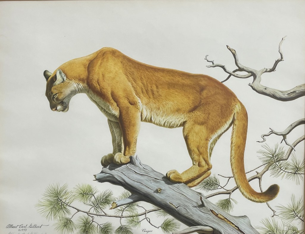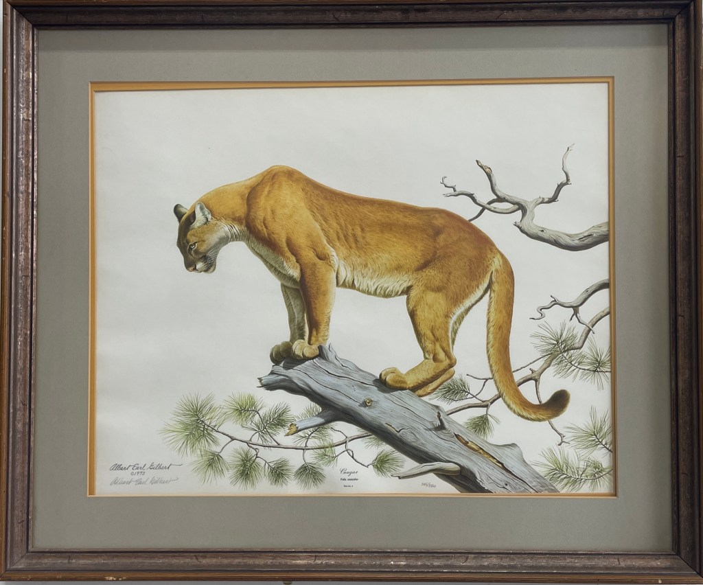 Albert Earl Gilbert’s wildlife work is known for its precision and quiet drama, and this limited edition print captures a cougar balanced on a weathered branch with striking realism. The detailed musculature, soft fur rendering, and careful attention to natural habitat reflect Gilbert’s deep respect for the animals he portrays, making this piece a strong example of his 1970s wildlife illustration.
