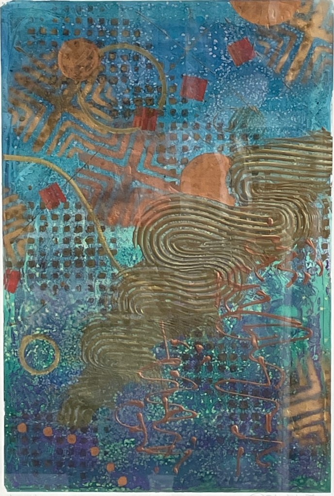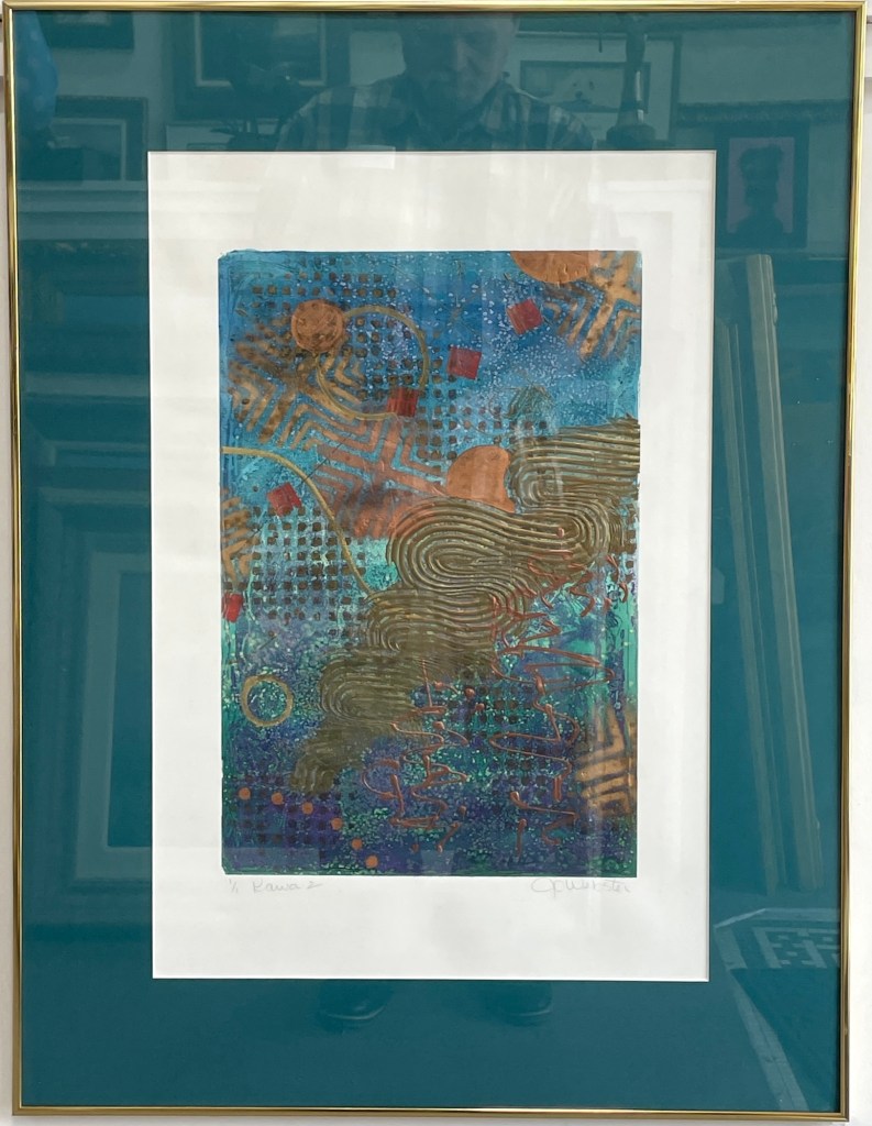 A richly layered monotype by Carolyn Webster, Kawa 2 blends geometric rhythm with organic motion. Copper, teal, and crimson tones swirl through gridwork and circular motifs, creating a dynamic interplay of structure and spontaneity. Signed and framed with a teal mat and gold trim, this piece pulses with visual energy.