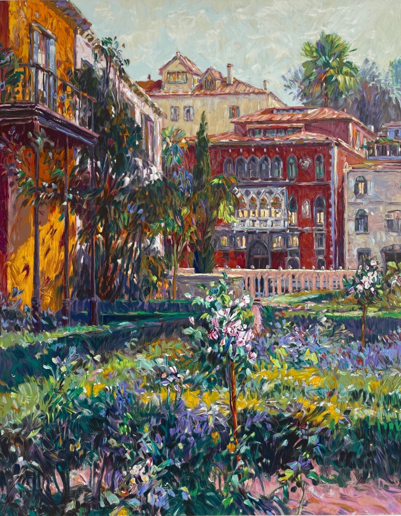 A celebration of Mediterranean charm, Venetian Summer captures the warmth and elegance of a sunlit garden framed by ornate architecture. French artist Henri Plisson is known for his romantic landscapes and vibrant palette, often drawing inspiration from European coastal towns. In this serigraph, expressive brushwork brings blooming flowers, red-tiled roofs, and palm-lined courtyards to life. The scene radiates tranquility and nostalgia, inviting viewers to linger in its lush serenity. Offered at $500 unframed.
