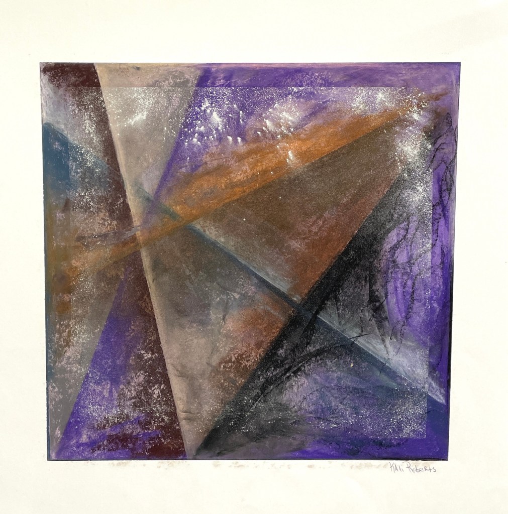 A square burst of geometric tension and tonal depth, Abstract #413 by Kati Roberts blends purples, browns, and blacks into a layered field of intersecting forms. Diagonal lines and textured gradients create a moody rhythm that invites introspection.