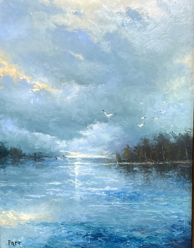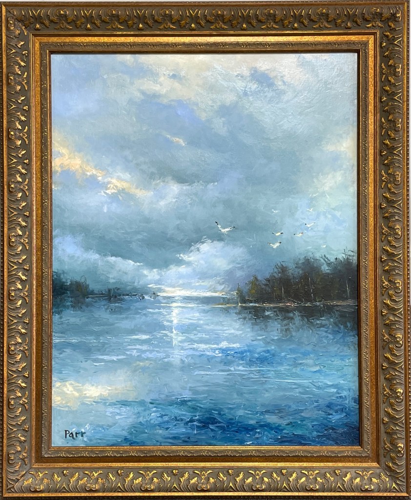 A burst of light breaks through a dense sky, casting reflections across still water as birds rise into motion. Parr’s brushwork captures the drama of shifting clouds and the quiet tension between shadow and illumination. The silhouetted shoreline anchors the composition, while the open sky evokes a sense of release and renewal.